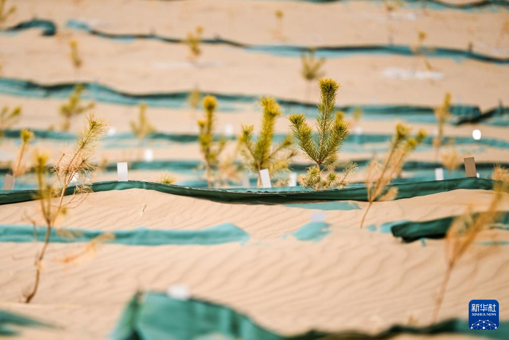 在通辽市科尔沁区大林镇拍摄的栽植在羽翼袋沙障内的樟子松(3月27日摄)。