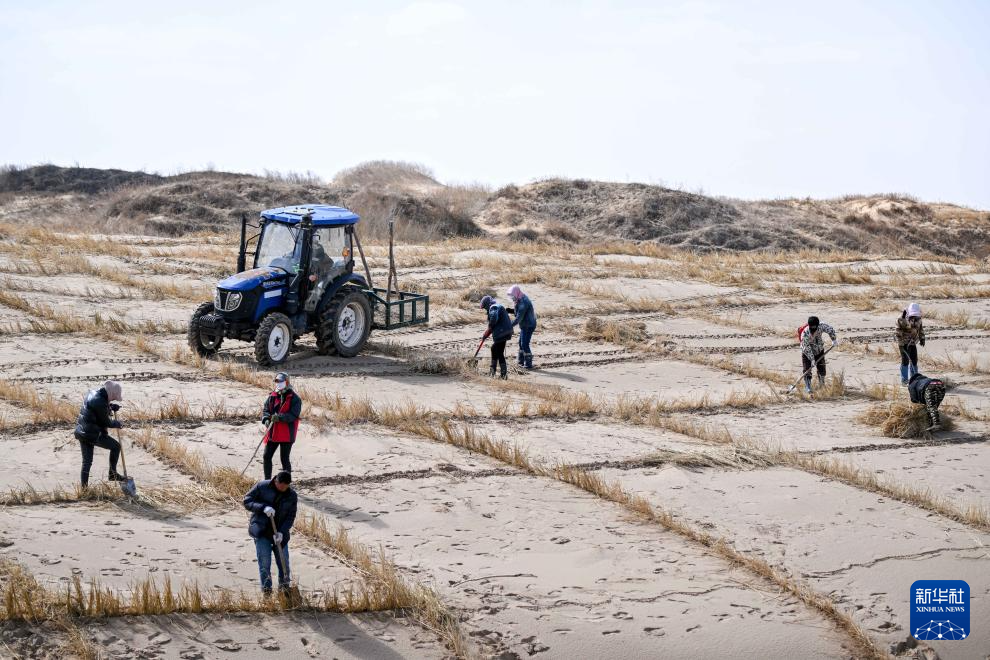 在通辽市科尔沁左翼后旗阿古拉镇,治沙工人在科尔沁沙地里打草方格(3月28日摄)。