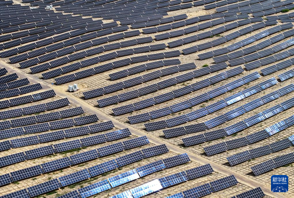 这是在赤峰市敖汉旗敖润苏莫苏木沙地上建起的光伏发电项目(无人机照片,5月16日摄)。