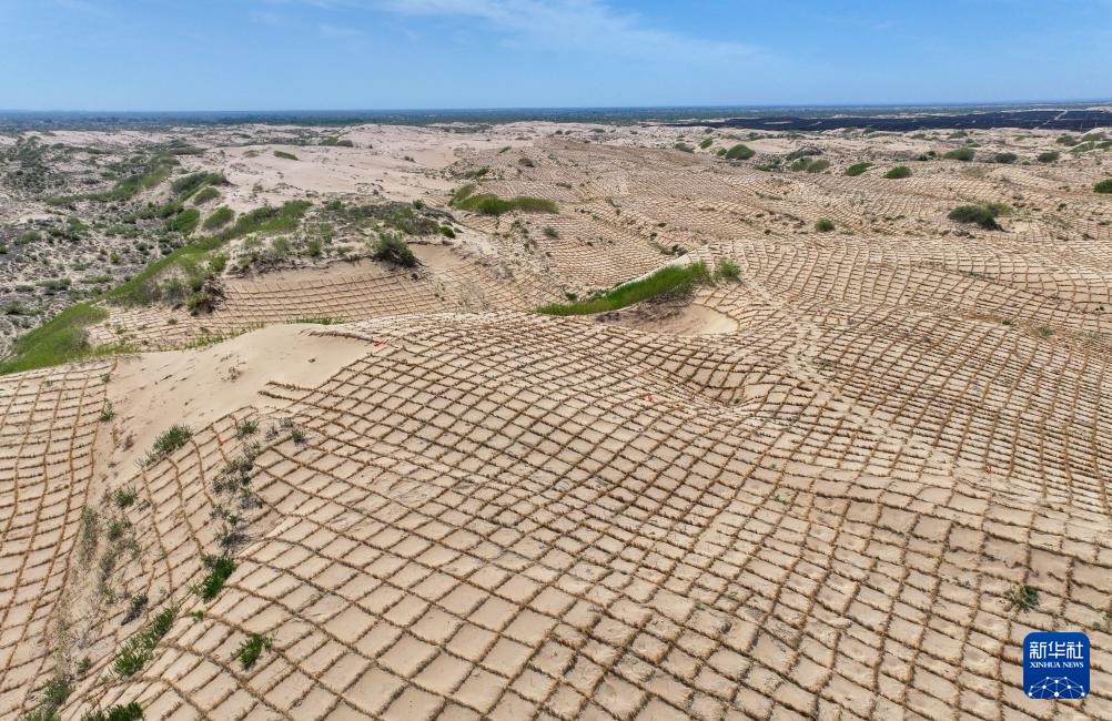 在赤峰市翁牛特旗巴彦呼交嘎查其白线防沙治沙项目区,穿沙公路将沙地切割,沙丘被逐步固定(无人机照片,5月16日摄)。