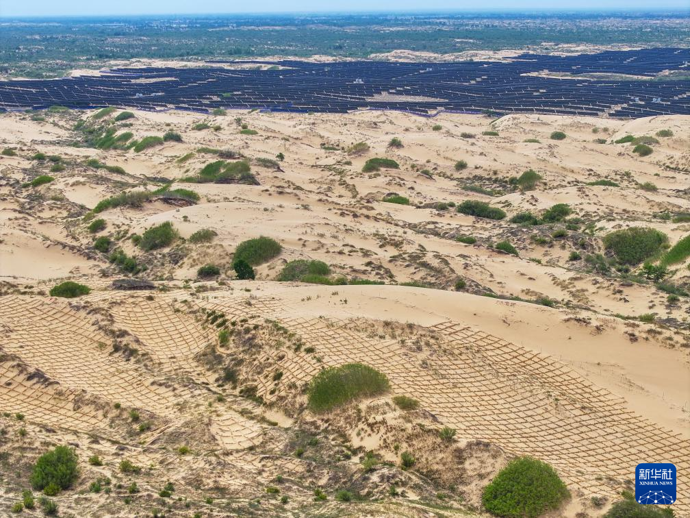 在赤峰市敖汉旗敖润苏莫苏木,沙丘被草方格固定,远处是沙地上建起的光伏发电项目(无人机照片,5月16日摄)。