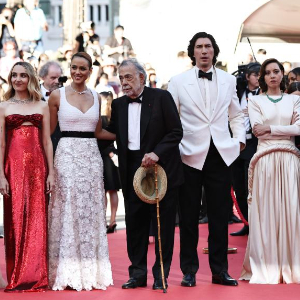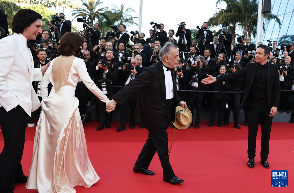 5月16日,在法国南部小城戛纳举行的第77届戛纳国际电影节上,主竞赛单元影片《大都会》的导演弗朗西斯·科波拉(右二)携主创出席首映礼。