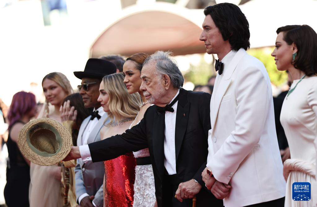 5月16日,在法国南部小城戛纳举行的第77届戛纳国际电影节上,主竞赛单元影片《大都会》的导演弗朗西斯·科波拉(右三)携主创出席首映礼。
