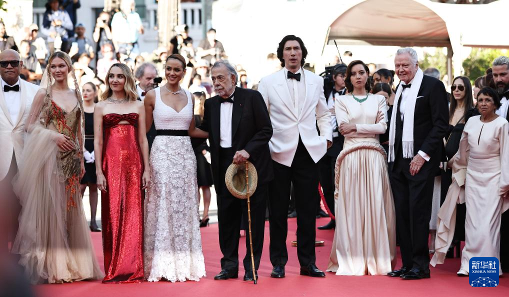 5月16日,在法国南部小城戛纳举行的第77届戛纳国际电影节上,主竞赛单元影片《大都会》的导演弗朗西斯·科波拉(左七)携主创出席首映礼。