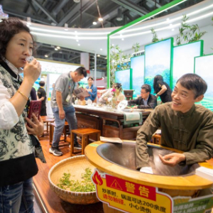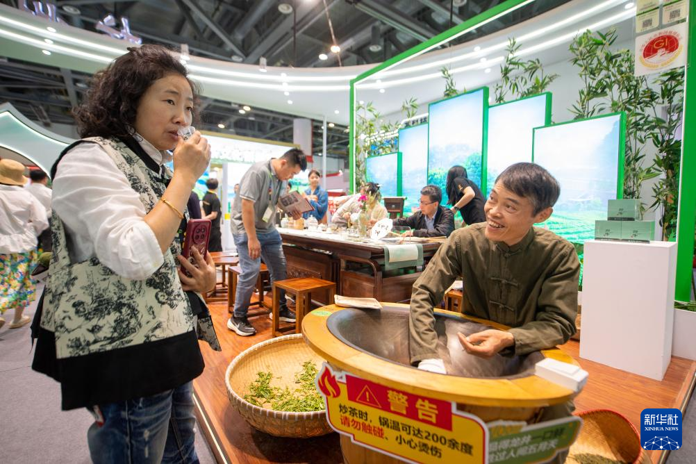 5月17日,观众在第六届中国国际茶叶博览会上品尝现场炒制的龙井茶。