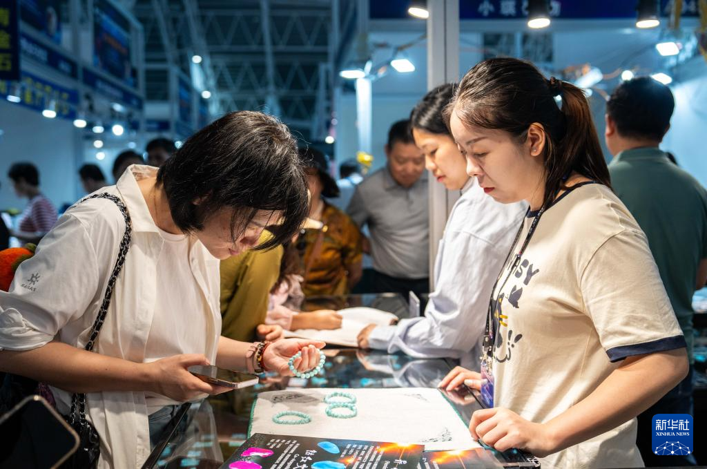 5月17日,在郴州国际会展中心,观众在挑选手链。
