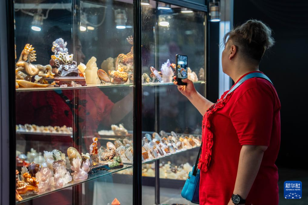 5月17日,在郴州国际会展中心,观众在拍摄矿石展品。