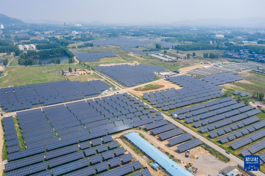 这是肥城市老城街道利用塌陷地建设的“农光互补”光伏发电项目(5月17日摄,无人机照片)。