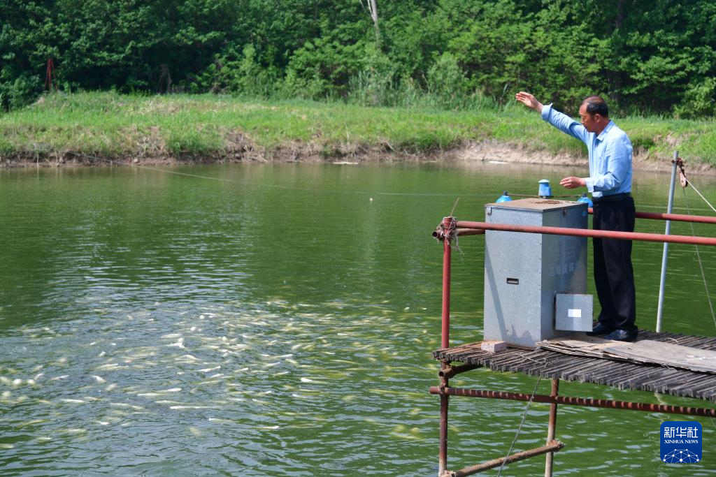 5月17日,在肥城市老城街道尚质居社区利用塌陷地改造成的生态鱼塘,居民在投喂饲料。
