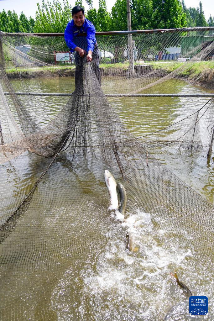 5月17日,在肥城市老城街道尚质居社区利用塌陷地改造成的生态鱼塘,居民在捕鱼。