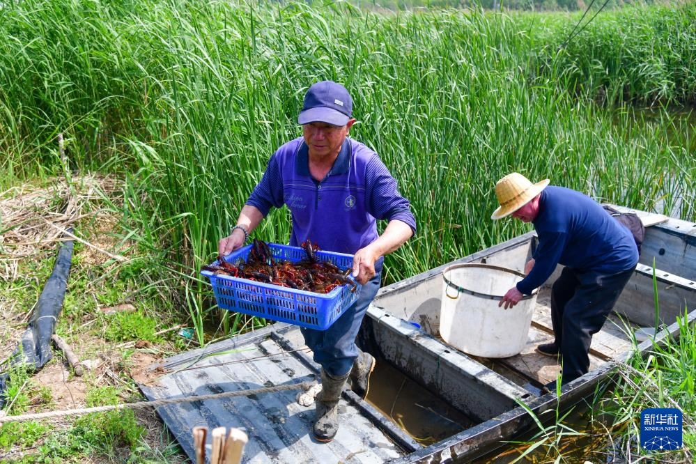 5月17日,在肥城市老城街道尚质居社区利用塌陷地改造成的生态鱼塘,居民在收获小龙虾。