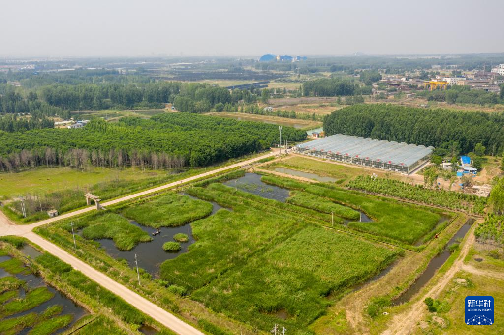 这是肥城市老城街道尚质居社区利用塌陷地建设的生态鱼塘(5月17日摄,无人机照片)。