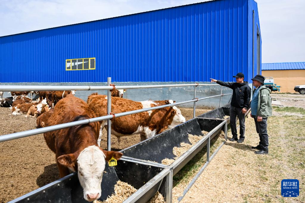 5月16日,西乌珠穆沁旗吉仁高勒嘎查党支部书记额日和穆巴特尔(左)与牧民在嘎查股份经济合作社交流肉牛养殖情况。