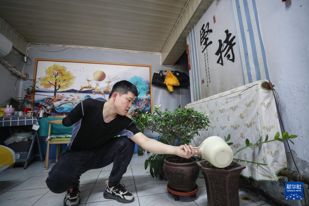 5月16日,王哲在家中浇花,出租屋虽然简陋但王哲把屋子收拾得干净整洁。王哲说:“房子是租的,但家是自己的。”