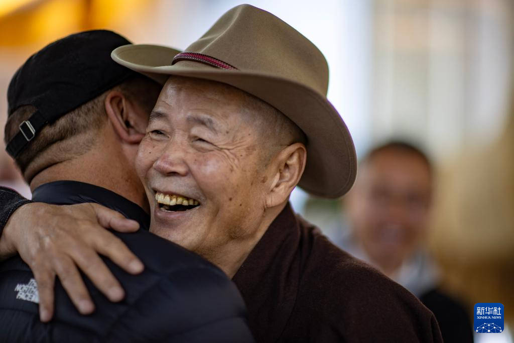 5月18日,吴雨初在西藏牦牛博物馆与友人拥抱。