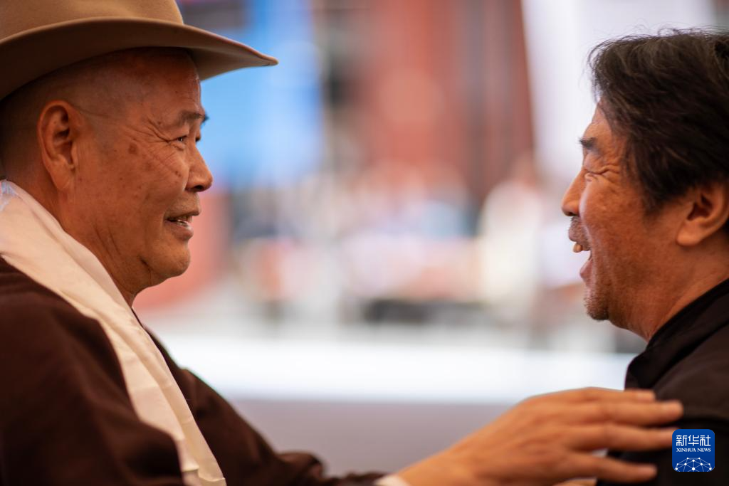 5月18日,吴雨初(左)在西藏牦牛博物馆与友人交谈。