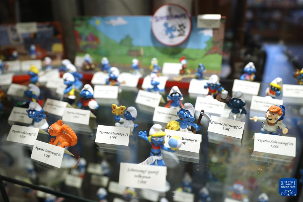 这是5月18日在比利时布鲁塞尔的漫画博物馆拍摄的蓝精灵玩偶。