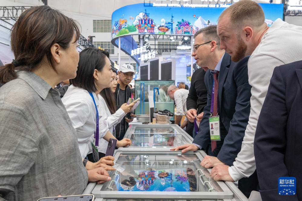 5月18日,几名俄罗斯客商在北大荒集团展区参观。