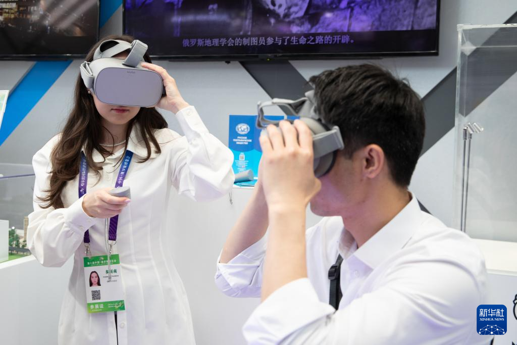 5月18日,在第八届中俄博览会现场,参会者通过VR技术观看俄罗斯生态风景。