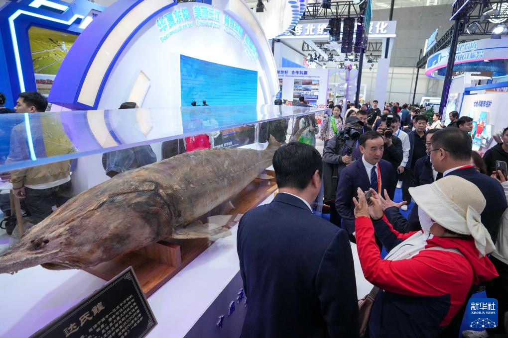 5月18日,参会者在佳木斯展区参观达氏鳇标本。