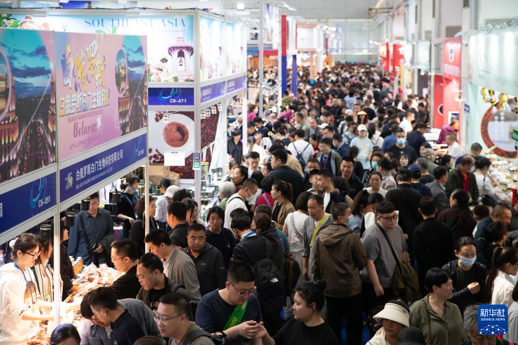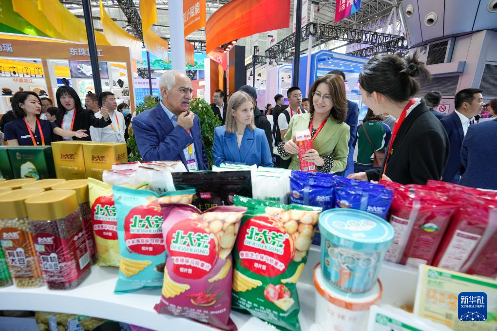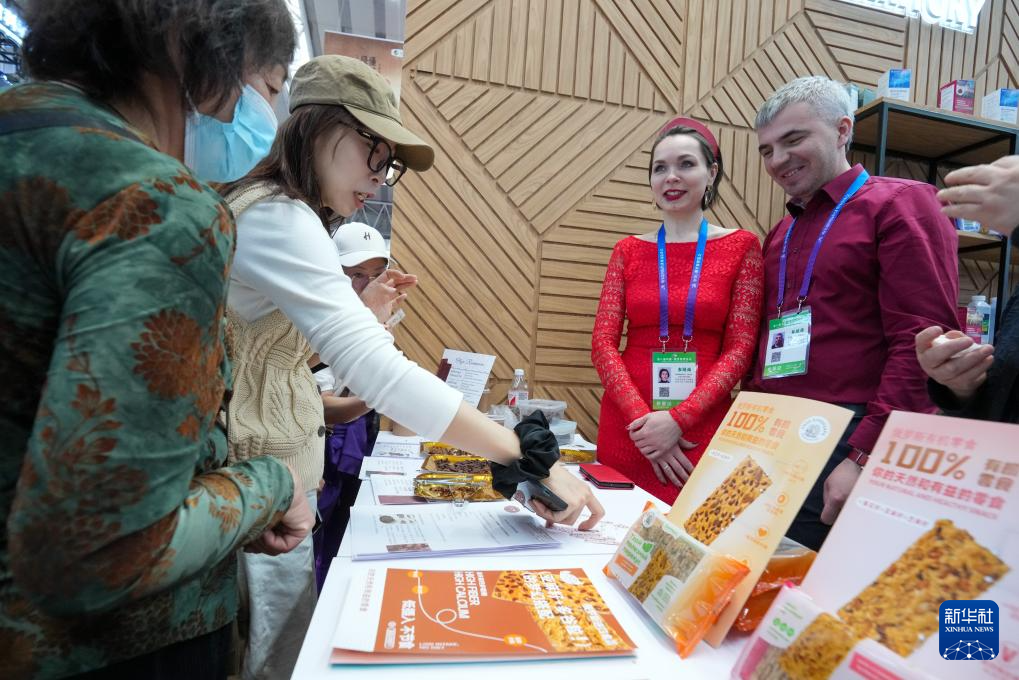 5月18日,参会者在一俄罗斯食品展位了解情况。