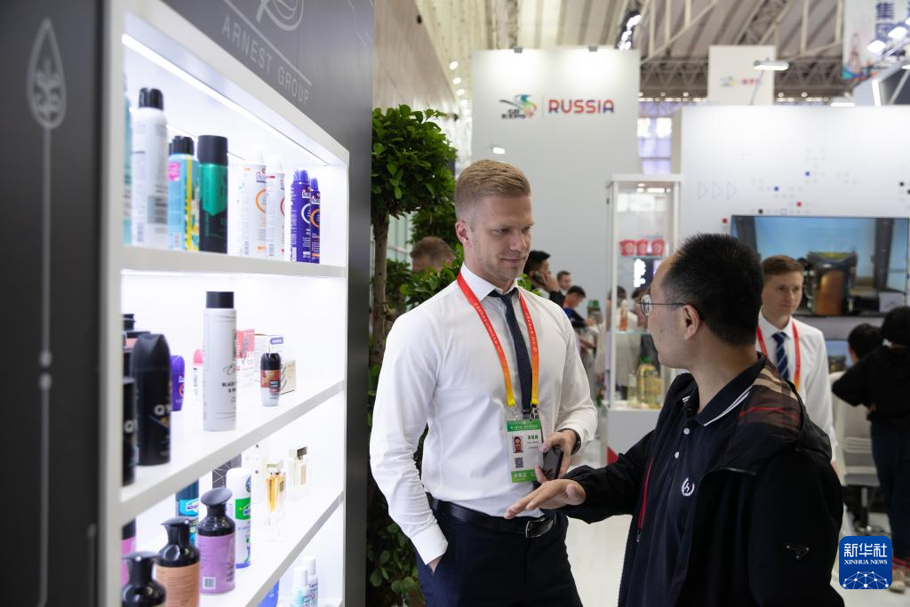5月18日,在第八届中俄博览会现场,俄罗斯参展商与客户沟通。