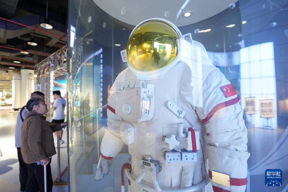 5月10日,在位于北京航空航天大学的北京航空航天博物馆内,参观者参观展出的神舟七号舱外航天服。