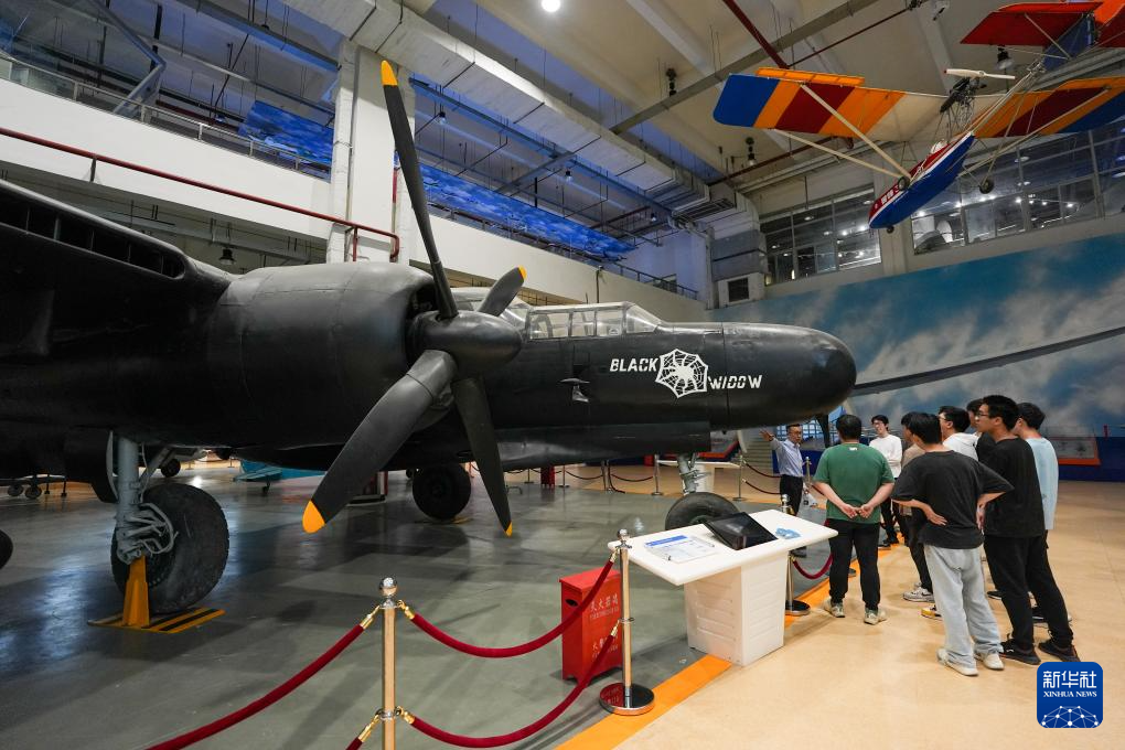 5月10日,在位于北京航空航天大学的北京航空航天博物馆内,学生在课上听老师讲解展出的第二次世界大战期间由美国诺斯洛普公司研制的P-61战斗机。