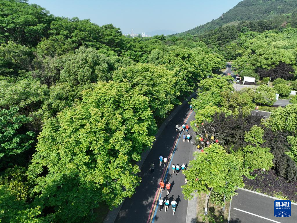 5月18日,参加“彩虹绳”例跑的人们在湖州市中心一个公园跑步。