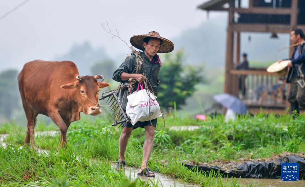 5月18日,在贵州省黎平县尚重镇洋洞村,村民牵着耕牛参加牛耕活动。