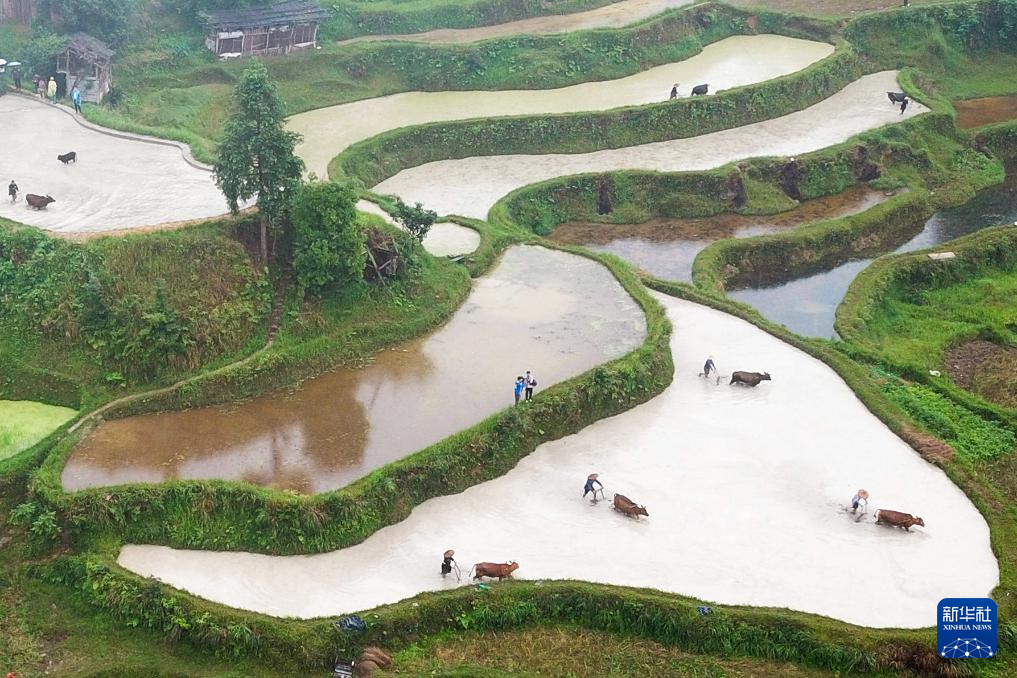 5月18日,在贵州省黎平县尚重镇洋洞村,村民在参加牛耕活动(无人机照片)。