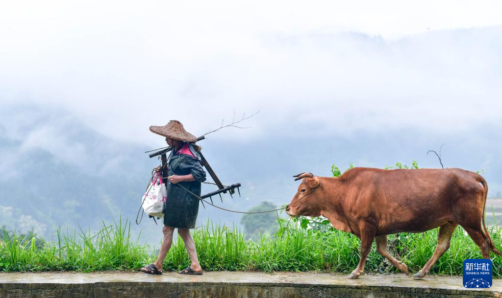 5月18日,在贵州省黎平县尚重镇洋洞村,村民牵着耕牛前来参加牛耕活动。