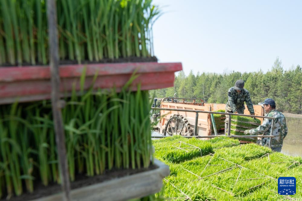 在北大荒集团前哨农场有限公司,农民把水稻秧苗搬上运苗车(5月8日摄)。