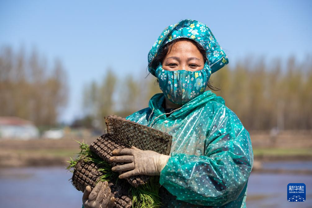 5月9日,在北大荒集团前哨农场有限公司一水田地块,来自齐齐哈尔市拜泉县的农民王淑凤抱着水稻秧苗准备插秧。