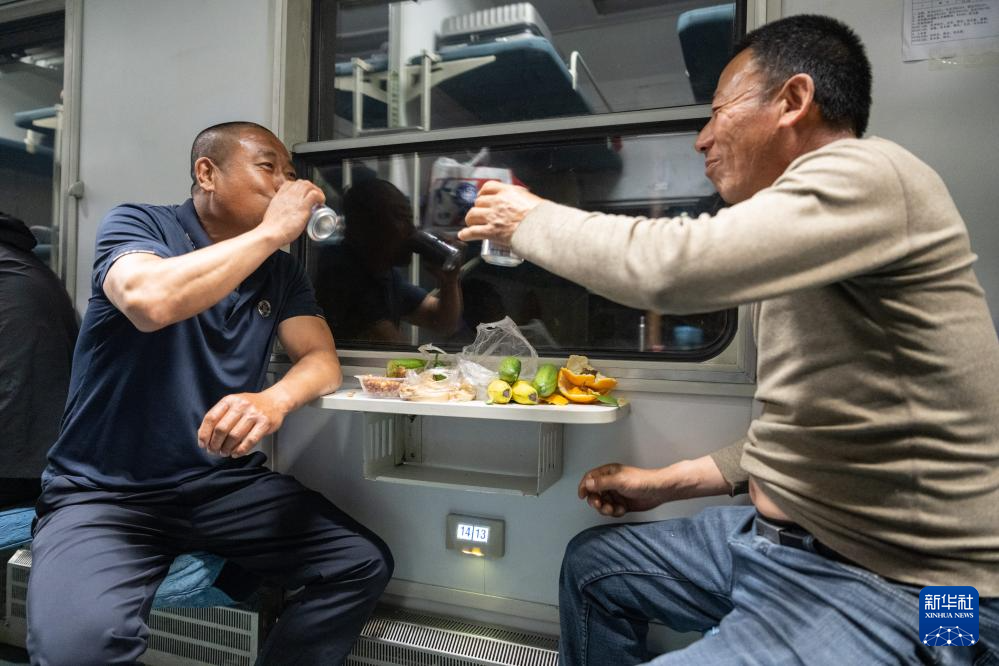 5月7日,插秧客在“插秧专列”K5161次列车上吃晚餐。