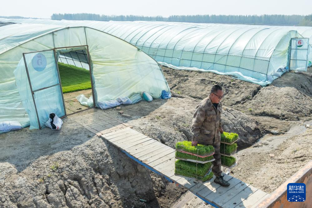 在北大荒集团前哨农场有限公司,农民从育秧大棚中搬出水稻秧苗(5月8日摄)。