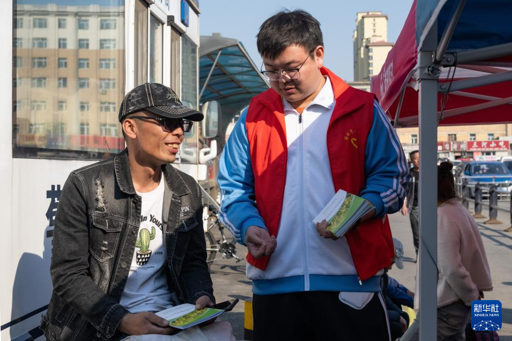 5月7日,在绥化站站前广场,绥化学院农业与水利工程学院的学生志愿者给插秧客免费发放水稻栽培技术手册。