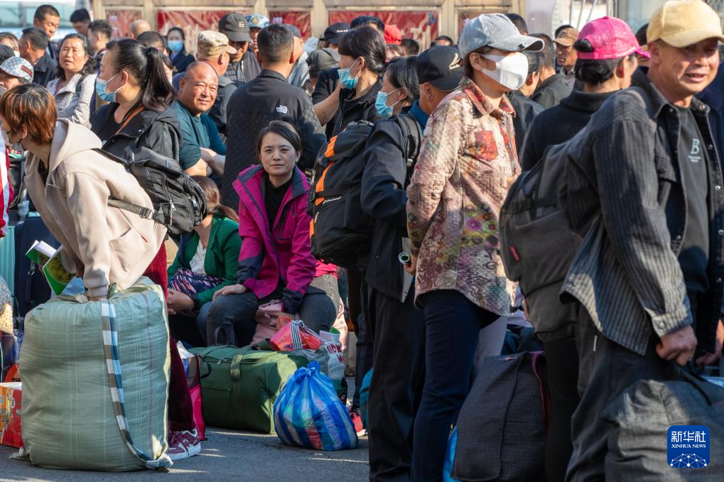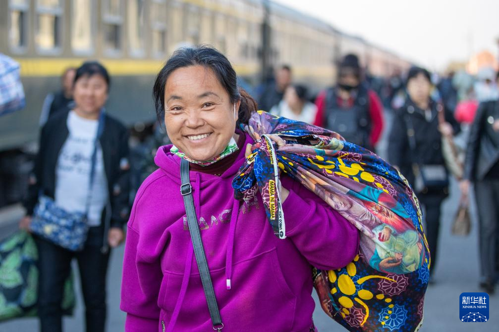 5月7日,在绥化火车站,插秧客准备登上“插秧专列”。