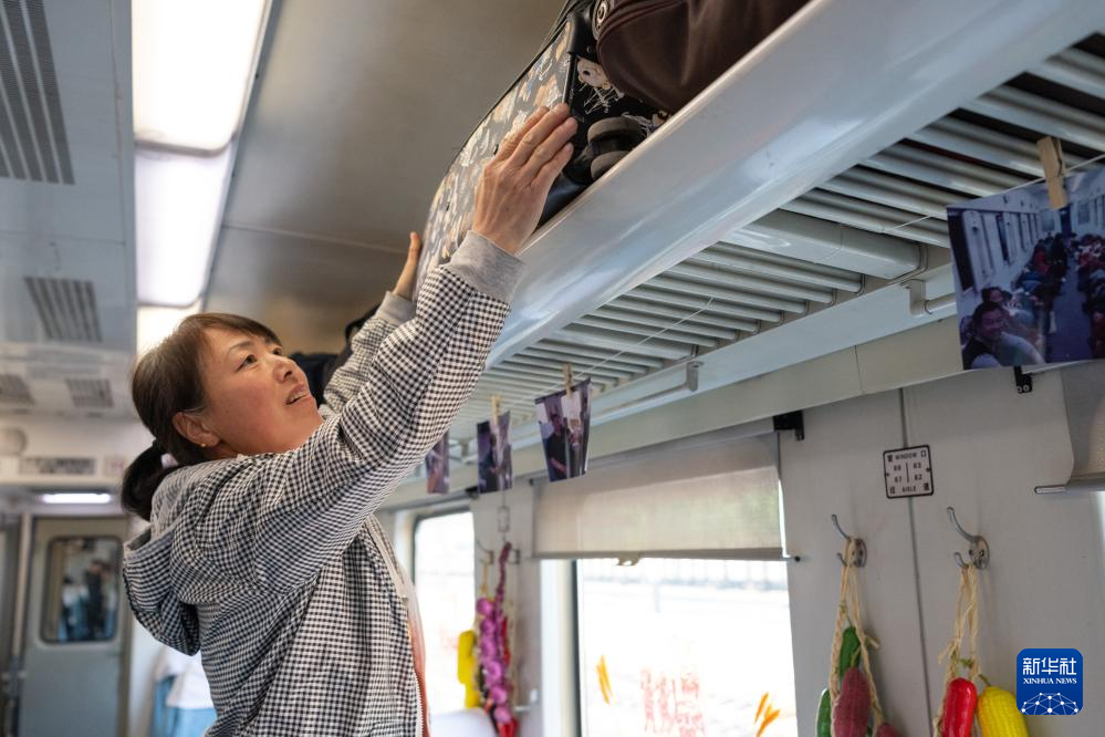5月7日,在“插秧专列”K5161次列车上,插秧客在码放行李。