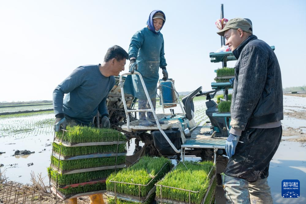 在北大荒集团前哨农场有限公司,农民把水稻秧苗搬上插秧机(5月8日摄)。
