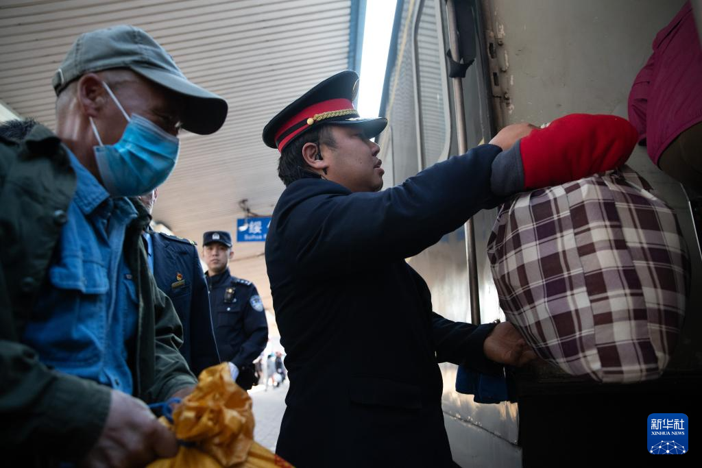 5月7日,在绥化火车站,“插秧专列”K5161次列车的列车员帮插秧客搬运行李。