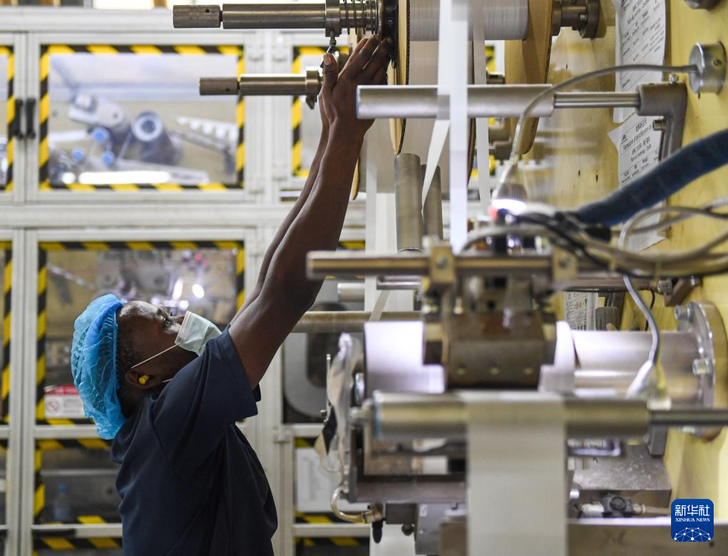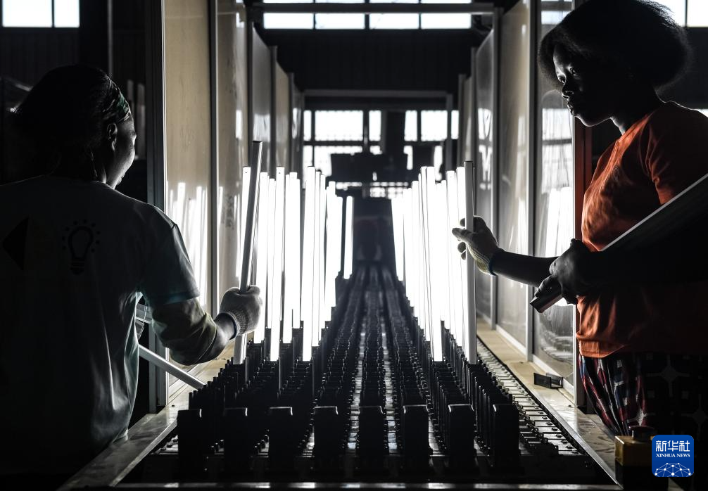 4月5日,在乌干达姆巴莱市中乌姆巴莱工业园,两名工人在明珠科技有限公司的车间进行质检。