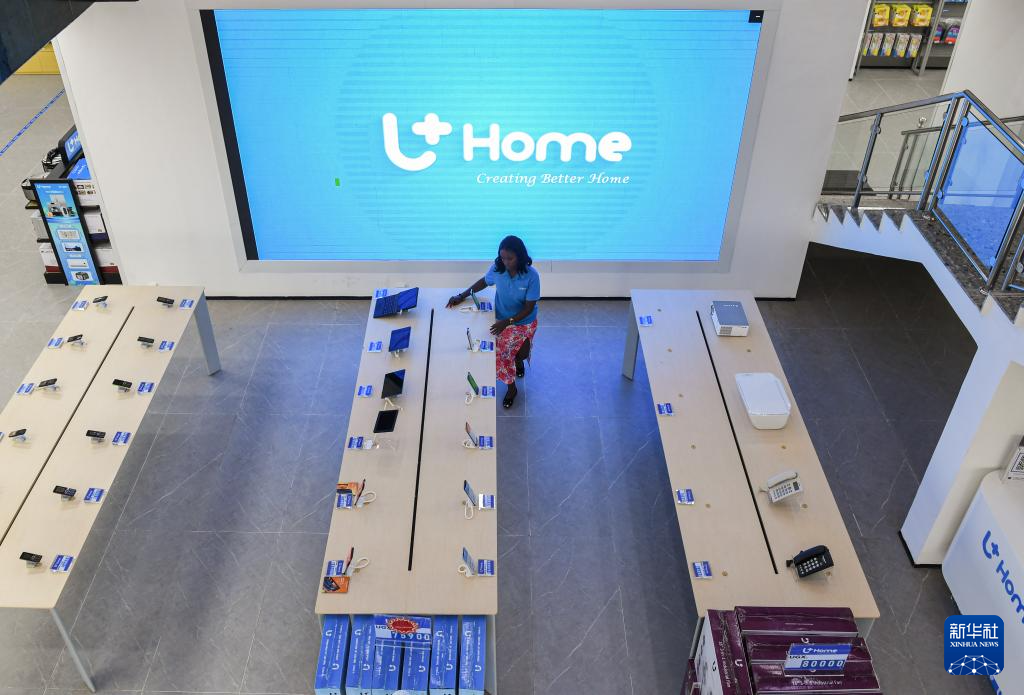 4月6日,在乌干达首都坎帕拉的UHome家电卖场,一名店员在整理商品。卖场里大部分家电由中乌姆巴莱工业园生产,自产自销。