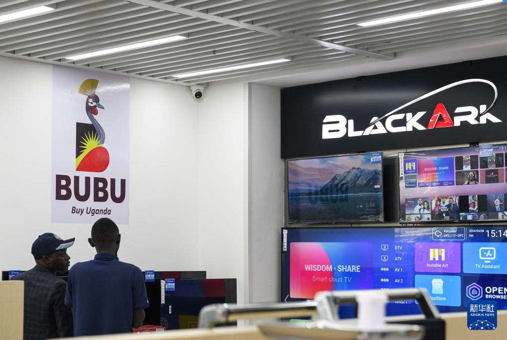 4月6日,在乌干达首都坎帕拉的UHome家电卖场,两名顾客在挑选商品。卖场里大部分家电由中乌姆巴莱工业园生产,自产自销。墙上宣传标语“BUBU”是“Buy Uganda, Build Uganda”(“买国货,建国家”)的英文缩写。