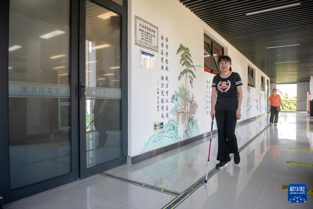 5月16日,盲人使用河庄文体中心设置的电子盲道前往无障碍图书馆阅读。