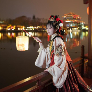 游客身穿汉服体验“夜游长安”(2024年2月13日摄)。