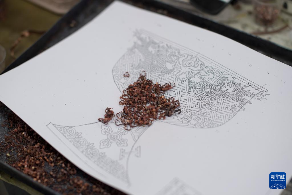 这是景泰蓝制作中的图样和制作好的掐丝(5月15日摄)。