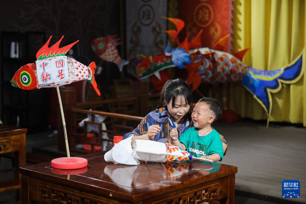 5月17日,游客在歙县徽州古城鱼灯馆体验绘制鱼灯。