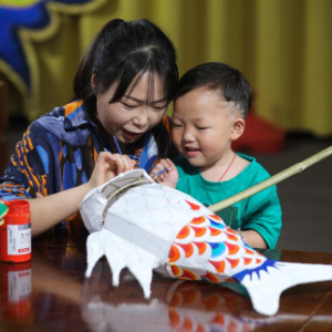 小朋友在溪头镇汪满田村鱼灯工坊内玩耍(5月10日摄)。