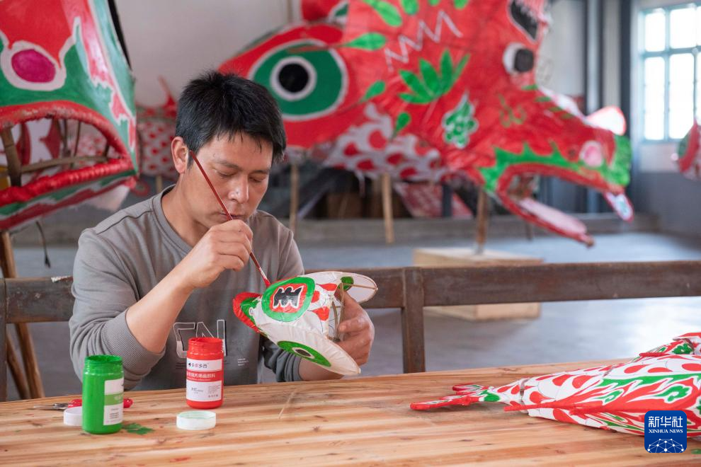 汪满田鱼灯县级非遗传承人汪华武在溪头镇汪满田村鱼灯工坊制作鱼灯(5月10日摄)。